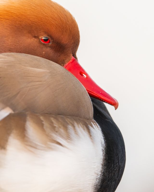 The red-crested pochards were so trusting that I was also able to take some portraits. I find red-crested pochards particularly interesting for such portraits because they can create very simple shapes in the picture with their plumage. Depending on the posture of the bird, completely different shapes can be created. This portrait was one of the photos in which I particularly liked the construction of the different shapes. I also have hundreds, if not thousands, of photos where the posture or perspective is slightly different and works rather less well as a photograph.