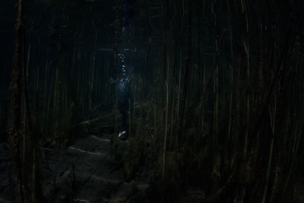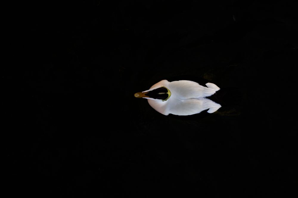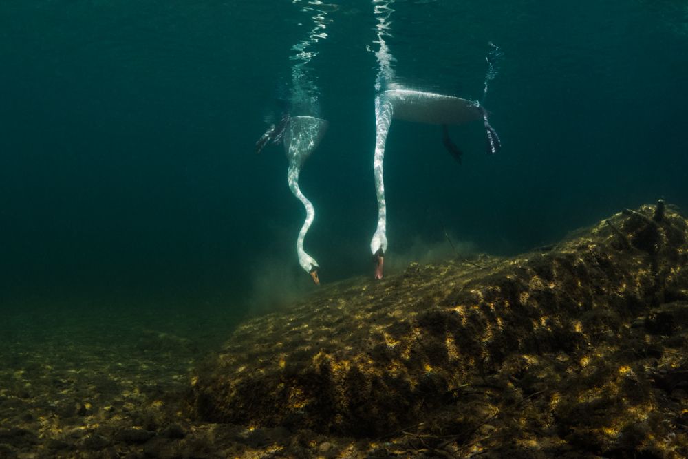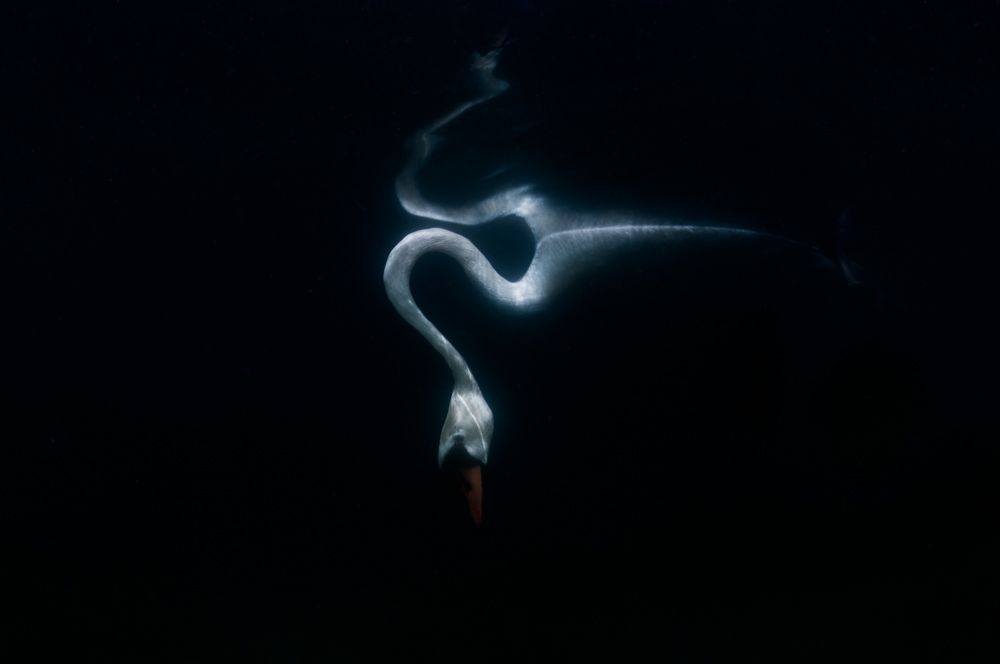 On that particular weekend it was relatively warm and so I was able to stand in the water with the underwater housing for the first time. I was not able to stand it for long, but the time was enough to take this photo of a mute swan. Because the sun was very high in the sky, I had to underexpose the photo quite a lot, which resulted in this very dark photo. I think the dark background works very well and gives the image a mystical feel.