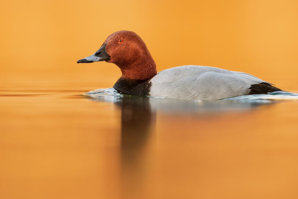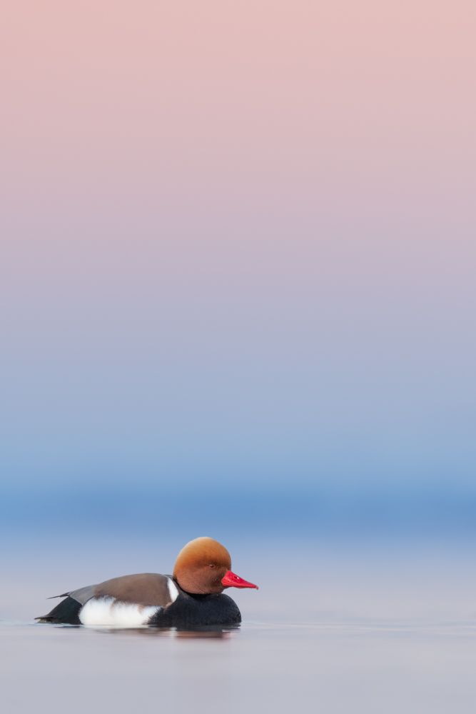 In April I spent quite a lot of time with a group of red-crested pochards, which were quite trusting. This photo was taken just before sunrise. The sky had a wonderful colour gradient which complemented the colours of the lake in the background very well. To show as much of the overall colour gradient as possible, I chose to crop the picture in portrait format. As the cob ducks were quite mobile, I could also try different distances to the bird. In this picture, the bird was just far enough away so that it was not too small or too large.