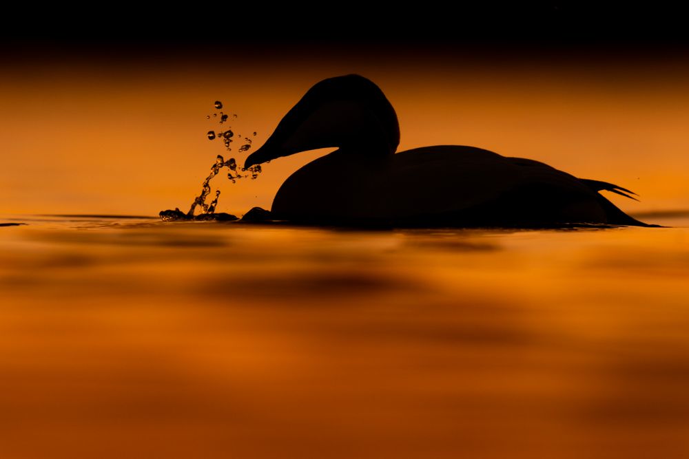 As the light gradually improved, the eiders swam a little further along the shore. Eventually they reached a section of the shore where we even had the opportunity to photograph at eye level. As the birds were right in front of the setting sun, we were able to photograph them in silhouette against the orange glowing water.