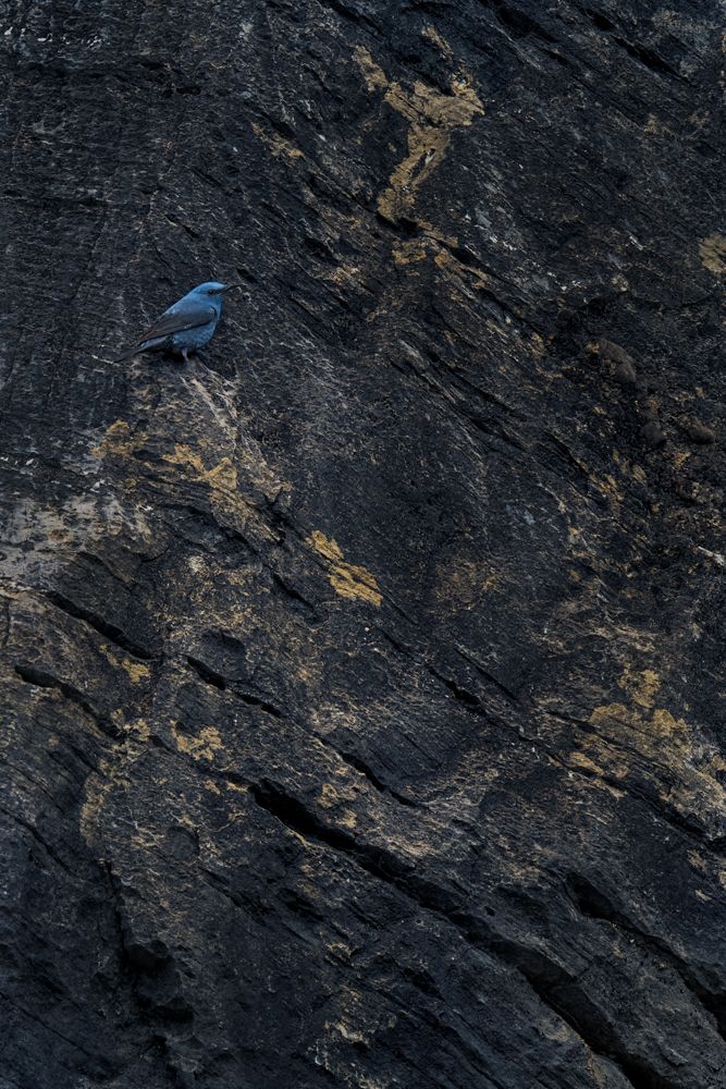 This spring I unfortunately never had much time for bigger trips in Switzerland. But one saturday I made it to the Valais, where I found this blue rock thrush in a big rock face. It was quite shy, but I am very happy with this photo. It doesn't necessarily correspond to my usual style, but it suits this bird very well. As the bird was quite mobile, I was able to photograph it in front of various rock structures. In this photo I particularly liked the structure of the rock. Especially because of the yellow rock, which creates a certain colour balance.