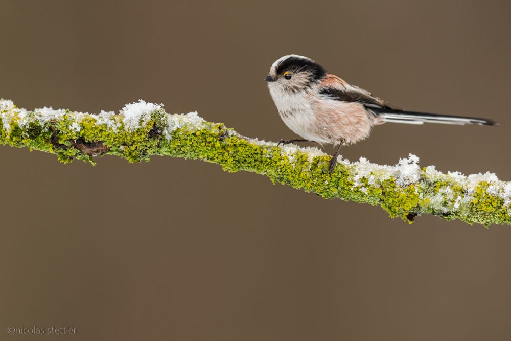 The temperature was hovering around zero that day and there was a strong wind. The snow kept thawing until the next snowfall covered the landscape in white again. It was constantly dripping down from the trees and so after a few hours I was completely soaked. Due to the quite strong wind, I soon had cold and wet fingers. Apart from the shutter release and the button for the autofocus, I couldn't really operate the camera well anymore and so I decided to pack up. I was just about to take the camera off the tripod when, out of nowhere, this long-tailed tit landed on my branch. As quickly as it came, it was gone again, but the time had been enough and of the 5 photos taken, exactly one was perfectly sharp.