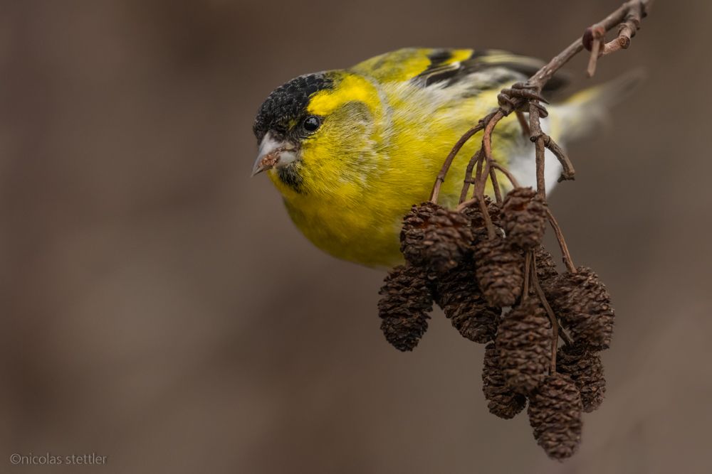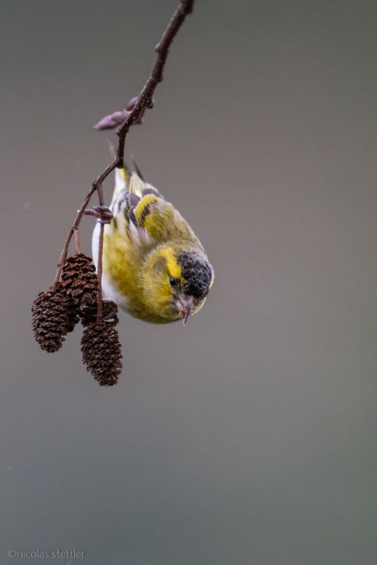 This winter there have been an extraordinary number of siskins in Switzerland. After I had never been able to get a good photo of this beautiful species in previous years, I was finally able to do so on the 3rd day of the year. A flock of more than 30 siskins was climbing around in a few alders on the bank of a river. I was standing slightly elevated on a path and was thus able to photograph the birds practically at eye level, if not even somewhat from above. This way I didn't have the cloudy sky in the background, but the trees from the other bank. Now all I had to do was catch a bird that would sit in a good spot.