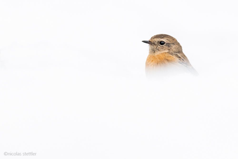 When it started snowing that afternoon, I was still sitting in school programming a simple circuit in the supplementary subject. I could hardly wait until the school bell finally rang. When I arrived home, I quickly exchanged my school backpack for my photo backpack and got back on my bike. Because of all the snow, I didn't make too much progress. But I didn't really have to go far, because just a few minutes later I spotted a couple of stonechats. They must have been surprised by the snow and were looking for food on the lakeshore. One of the females was quite confident and landed in the snow just in front of me. Fortunately, I had already anticipated this and adjusted my camera accordingly beforehand. Therefore I just had enough time to get one sharp photo before the bird moved on.
