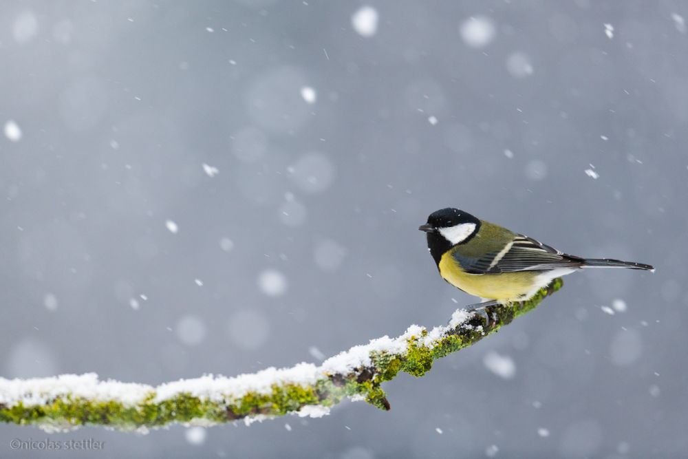 In winter, various songbirds can be observed at bird feeders. I looked for a nice branch on the forest floor and attached it to my tripod. In addition, I borrowed a bird feeder, which was attached to a bush next to the forest path. The birds didn't take long to land on the positioned branch. Especially great tits and blue tits landed on it again and again before jumping onto the bird feeder. That morning, several heavy snowfalls passed by. But the birds were not discouraged by them and I was able to take some photos of these birds in the snow. This photo of a great tit is my favourite of all the photos.