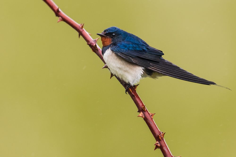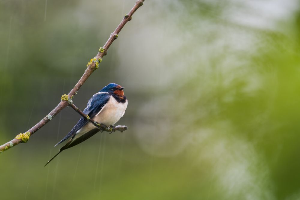 This spring the barn swallows were greeted by a bad weather front. This forced them to interrupt their migration northwards. Braving the rain, a good 40 barn swallows perched on the trees along a riverbank. Fortunately, the birds were quite tolerant and I got quite close to them. After a good two hours in the pouring rain, the barn swallows had become so accustomed to me that I could practically walk around freely and thus try out a wide variety of compositions.