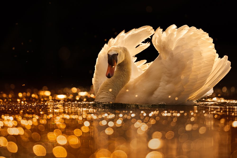 As the sun gradually lowered towards the horizon, I noticed this interesting play of light in the water. Now all that was left was for a bird to swim through the spot. I was lucky and this male mute swan had just spotted an intruder and was determined to scare it away. The intruder didn't hesitate at the sight and took off.