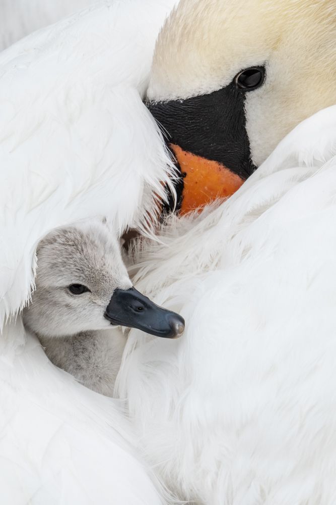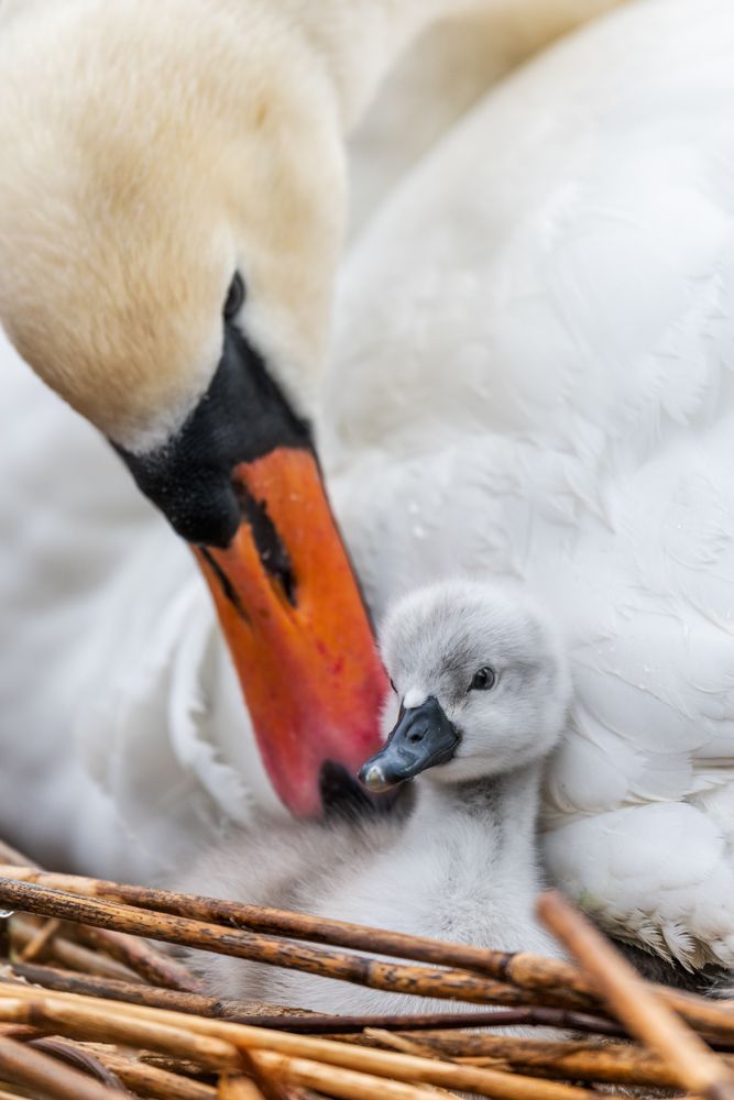 A pair of Mute Swans had already bred at this site in previous years. Only a few minutes away by bike, I visited the family again and again. When one day, the first young finally hatched, I spent several following mornings with them in hopes of photographing the chicks. But they took their time and stayed hidden under their mother's wings most of the time. Only on the fourth day, when only 2 eggs were left, did the youngsters gradually become impatient and peeped out more and more often. They even began to pick at the mother's plumage.